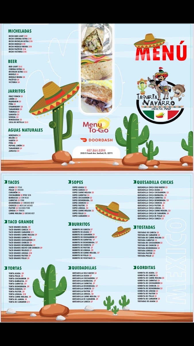 Introducing Taqueria Navarro, a delightful Mexican restaurant located at 2435 S French Ave, Sanford, FL. Renowned for its authentic street food, this family-owned gem began as a food truck and has since evolved into a must-visit dining spot. The menu shines with a variety of tostadas and tortas, featuring enticing options like Tostada De Lengua and Torta De Asada, ensuring there's something for every palate. Patrons rave about the homemade corn and flour tortillas, complemented by a vibrant salsa bar, adding a personal touch to each dish. Diners have expressed their love for the fresh, bold flavors, especially the carnitas and pastor tacos. Taqueria Navarro not only serves exceptional food at reasonable prices, but also boasts a friendly atmosphere where you're treated like family. With its commitment to quality and care, Taqueria Navarro is poised to become a staple for Mexican cuisine lovers in Sanford.